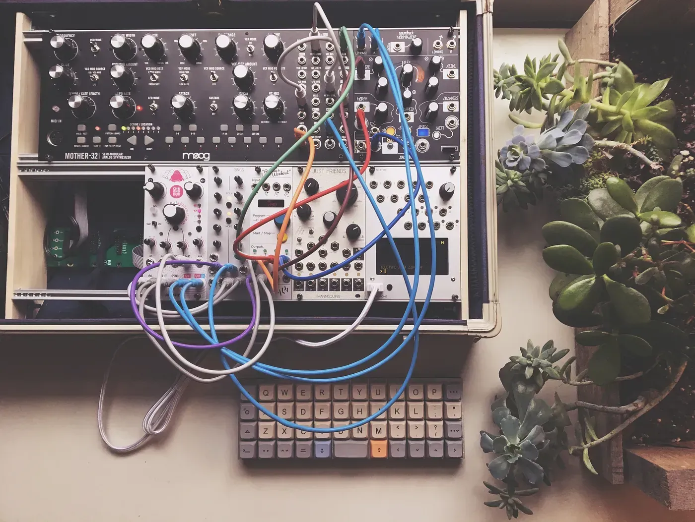Back when I used to play in awful metal bands, I was the guy with the synthesizers. I’ve always liked the mix of electronics, technology, and sound. I had a bunch of cheap gear up into the mid-2000s but sold it all to make space in my life for design (I was also pretty bad). This year I set out to explore music simply for the fun of it. Since I stare at screens all day, doing everything away from a computer was really important. I bought a Moog Mother 32, then a few months later a Moog Grandmother. I had every intention of staying away from eurorack and just patching with these but after attending a local modular meet-up, I sold my soul to the control voltages.I am slowly building a small case that is simple enough to let me learn the tech and what I like about sounds. I find that removing the visual feedback of the sound (common on most modern music apps) has allowed me to use a completely different part of my brain and this activity refreshes me during a lunch break.